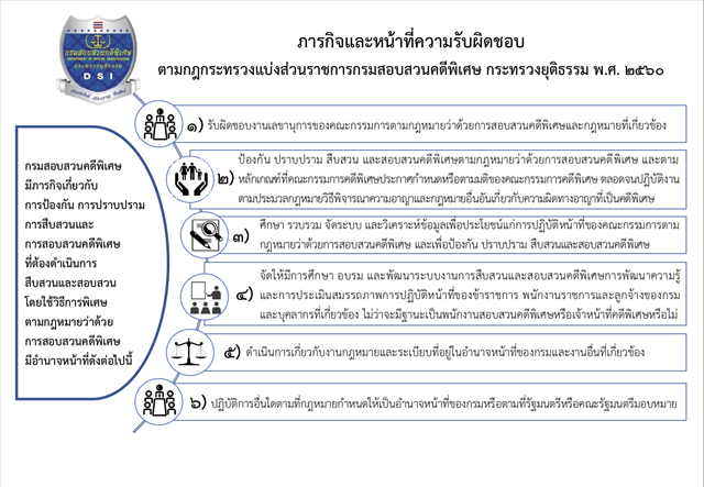 (1) รับผิดชอบงานเลขานุการของคณะกรรมการตามกฎหมายว่าด้วยการสอบสวนคดีพิเศษ และกฎหมายที่เกี่ยวข้อง